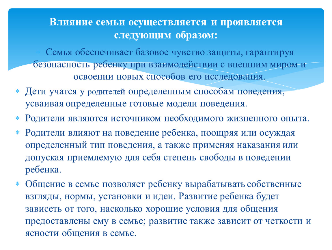 Влияние семьи осуществляется и проявляется следующим образом: