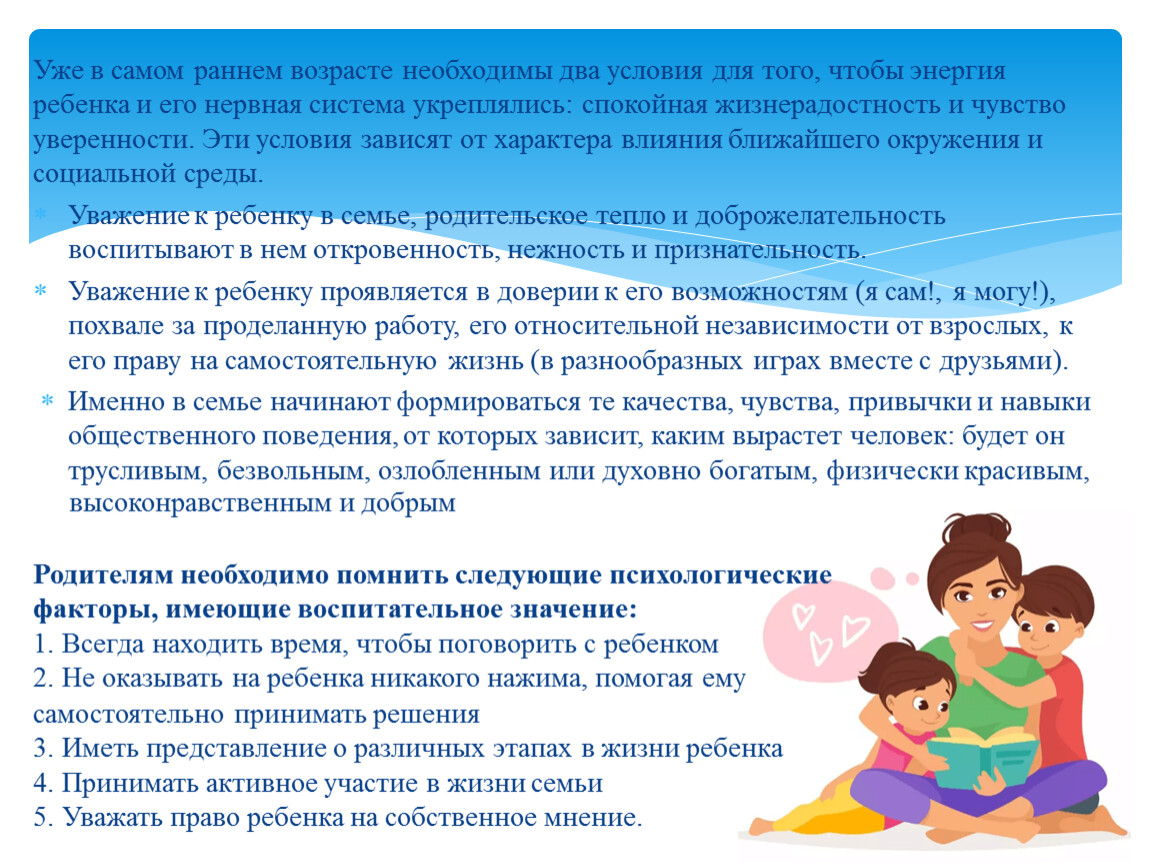 Родителям необходимо помнить следующие психологические факторы, имеющие воспитательное значение: