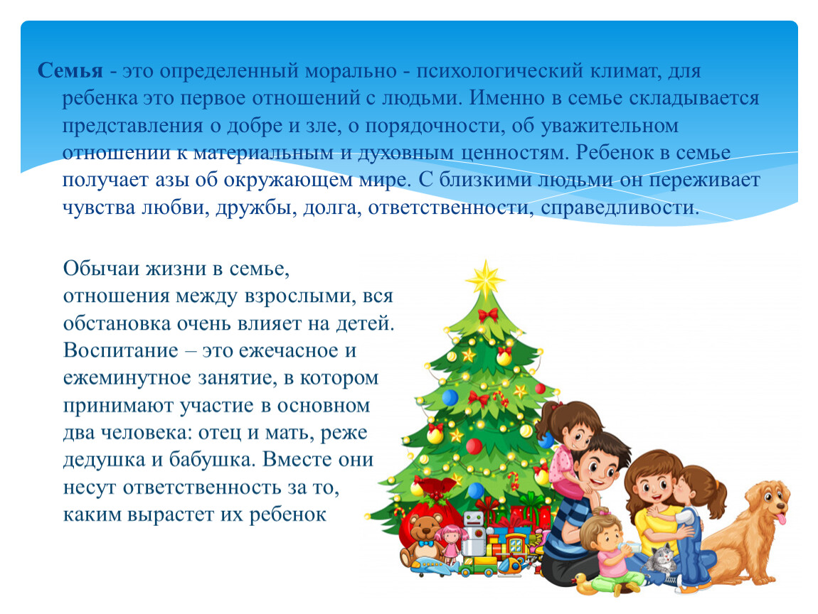 Семья - это определенный морально - психологический климат, для ребенка это первое отношений с людьми. Именно в семье складывается представления о добре и зле, о порядочности, об уважительном отношении к материальным и духовным ценностям. Ребенок в семье получает азы об окружающем мире. С близкими людьми он переживает чувства любви, дружбы, долга, ответственности, справедливости.