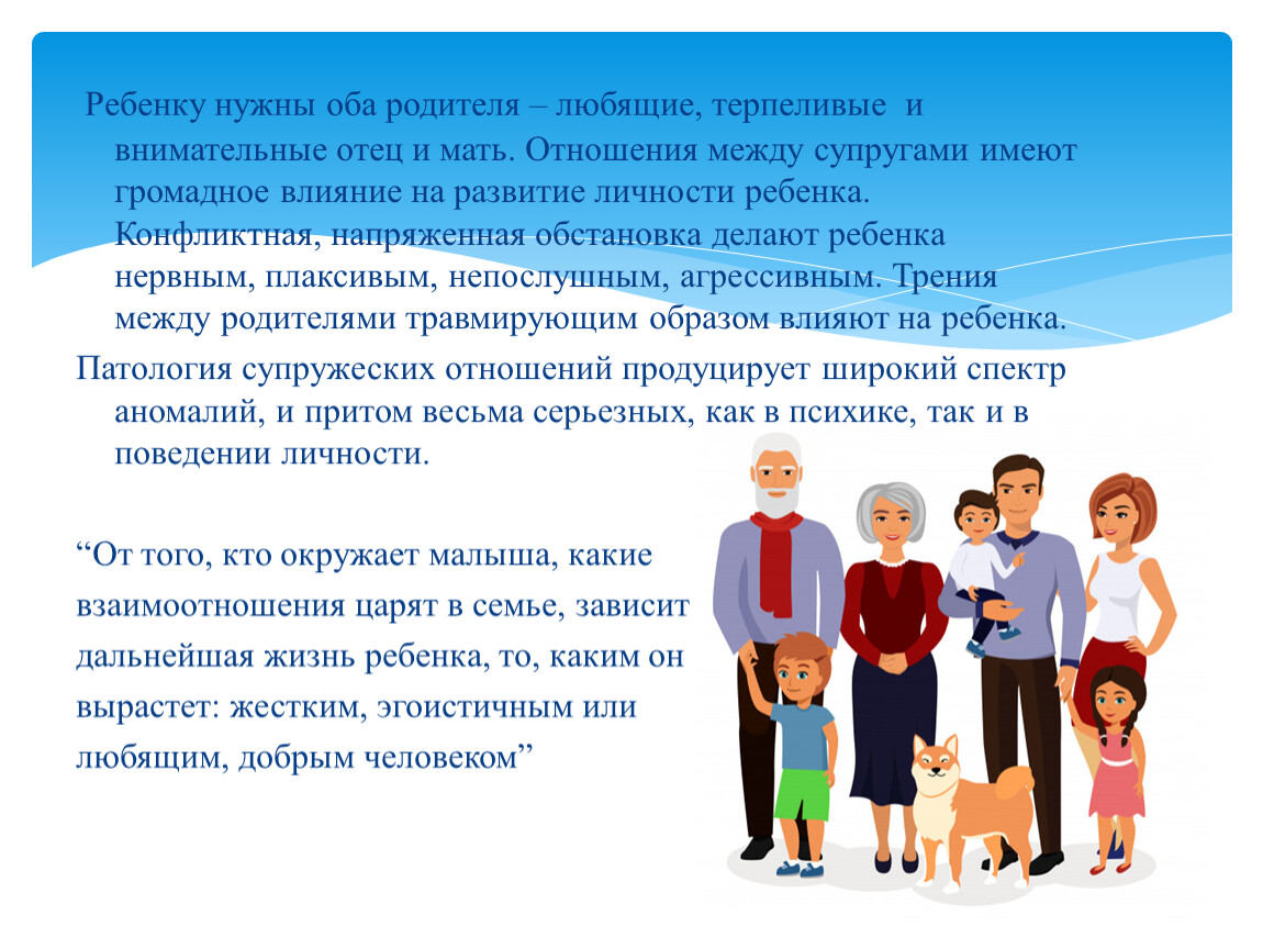 Ребенку нужны оба родителя – любящие, терпеливые и внимательные отец и мать. Отношения между супругами имеют громадное влияние на развитие личности ребенка. Конфликтная, напряженная обстановка делают ребенка нервным, плаксивым, непослушным, агрессивным. Трения между родителями травмирующим образом влияют на ребенка.