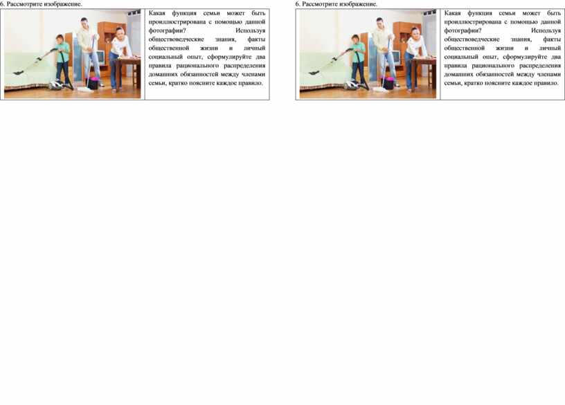 Какая функция семьи может быть проиллюстрирована с помощью данной фотографии? Используя обществоведческие знания, факты общественной жизни и личный социальный опыт, сформулируйте два правила рационального распределения домашних обязанностей между членами семьи, кратко поясните каждое правило. |