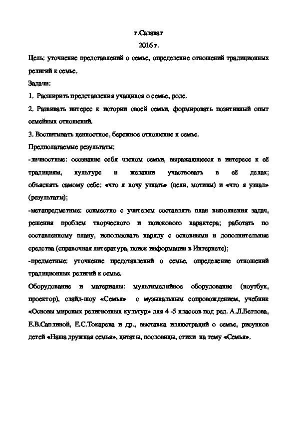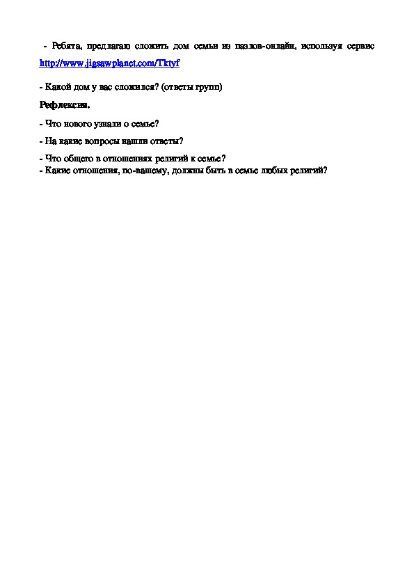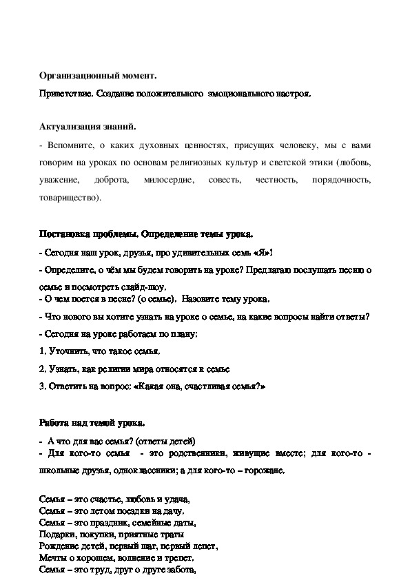 Цель: уточнение представлений о семье, определение отношений традиционных религий к семье.