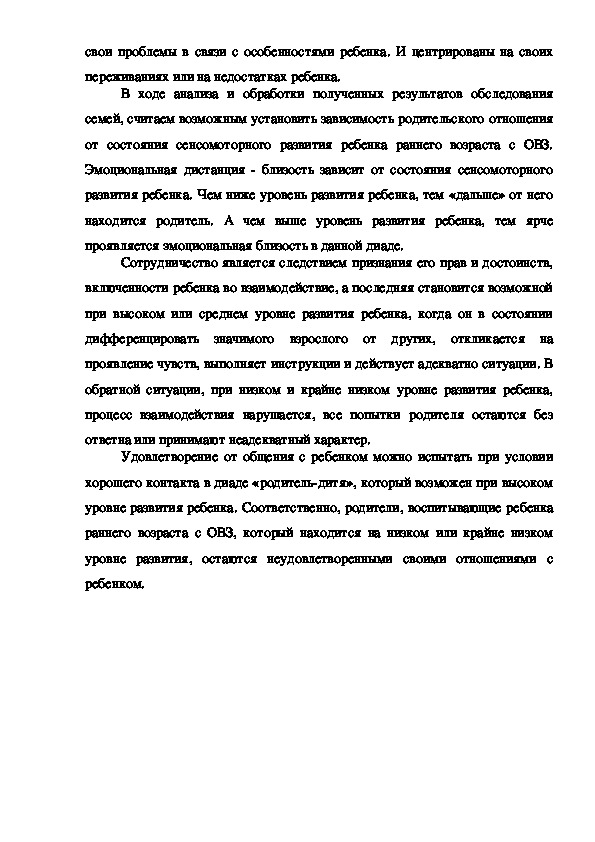Мы в своей работе под родительским отношением понимаем форму проявления эмоциональной близости, принятия ребенка, особенности его воспитания, результатом которых является удовлетворенность взаимодействием с ребенком раннего возраста с ОВЗ.