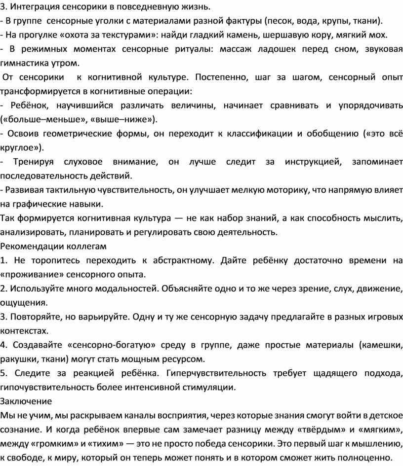 Мы не учим, мы раскрываем каналы восприятия, через которые знания смогут войти в детское сознание. И когда ребёнок впервые сам замечает разницу между «твёрдым» и «мягким», между «громким» и «тихим» — это не просто победа сенсорики. Это первый шаг к мышлению, к свободе, к миру, который он теперь может понять и в котором сможет жить полноценно.
