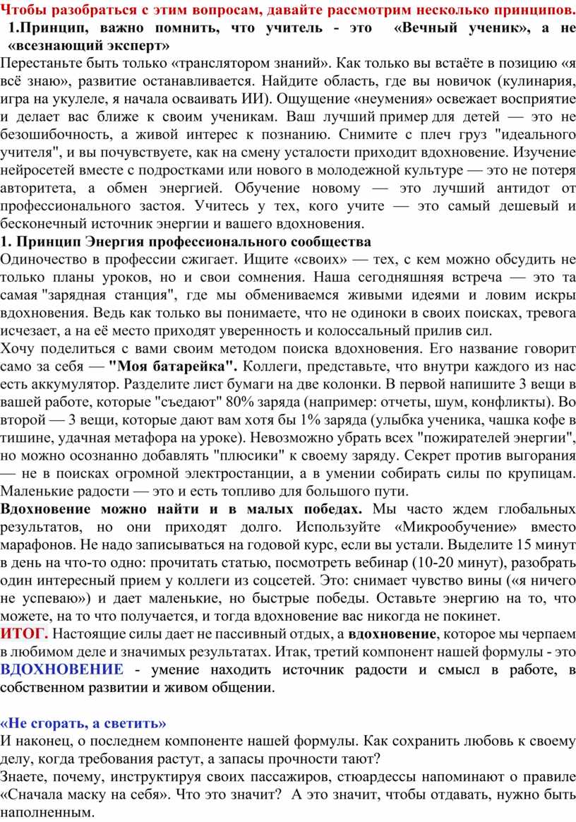 Чтобы разобраться с этим вопросам, давайте рассмотрим несколько принципов. 1.Принцип, важно помнить, что учитель - это «Вечный ученик», а не «всезнающий эксперт»