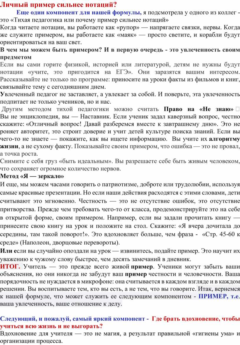 ИТОГ. Учитель — это прежде всего живой пример. Ученики могут забыть ваши объяснения, но они никогда не забудут ваш пример честности и человечности. Ваша порядочность не нуждается в микрофоне: она считывается в каждом взгляде и в каждом решении. Вы воспитываете тем, кто вы есть, а не тем, что вы говорите. Итак, вернемся к нашей формуле, что может служить ее следующим компонентом - ПРИМЕР, т.е. ваша увлеченность, ваше отношение к делу.