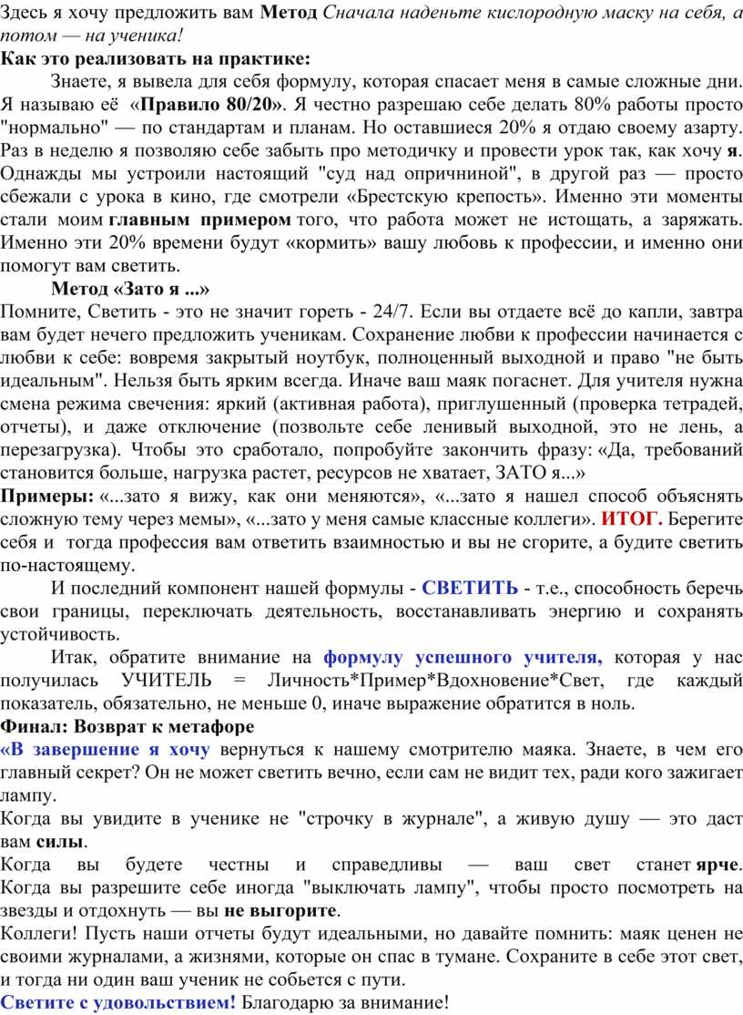 Примеры: «...зато я вижу, как они меняются», «...зато я нашел способ объяснять сложную тему через мемы», «...зато у меня самые классные коллеги». ИТОГ. Берегите себя и тогда профессия вам ответить взаимностью и вы не сгорите, а будите светить по-настоящему.