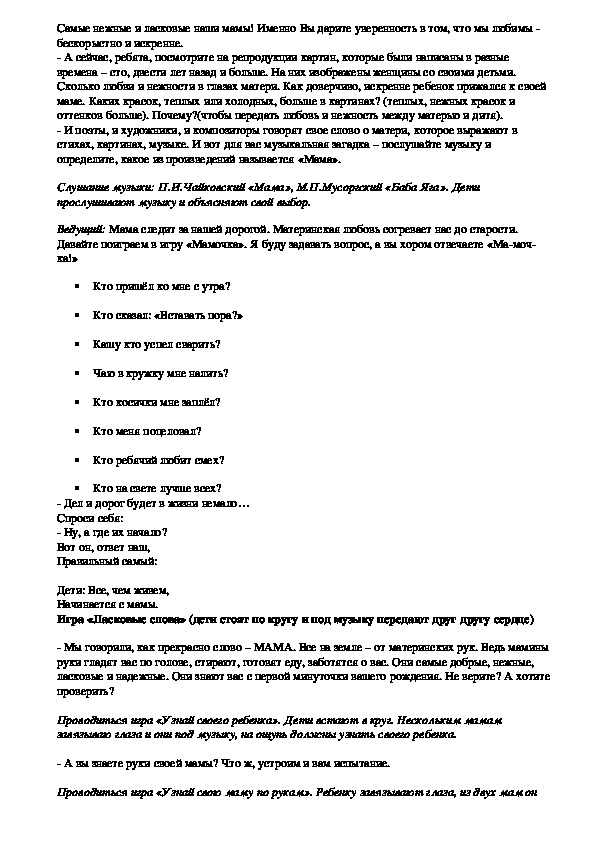 Представлен ценарий музыкально-познавательной программы к Дню Матери.