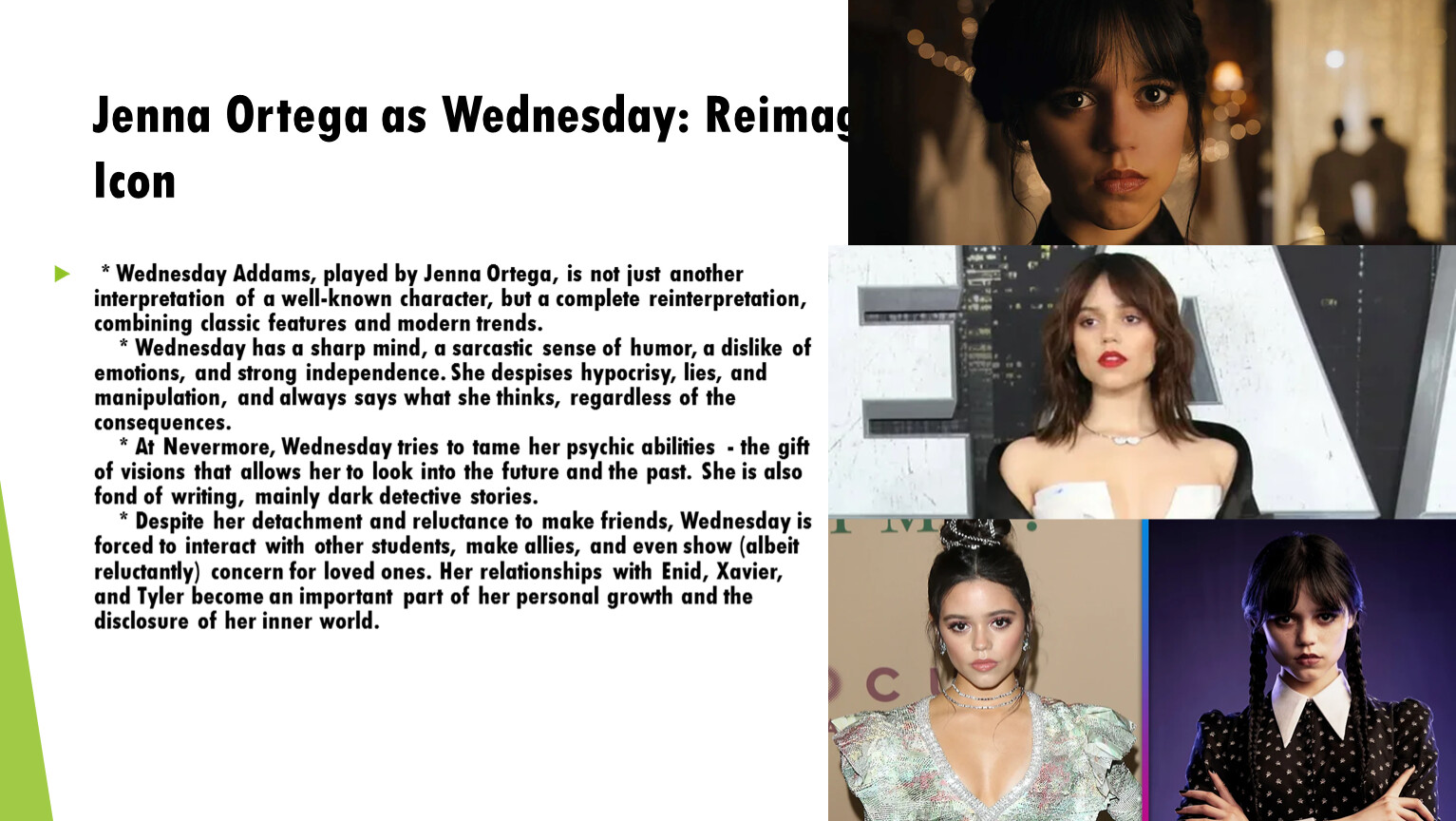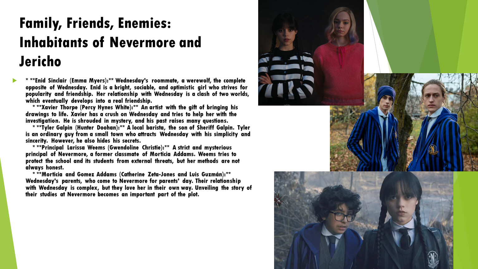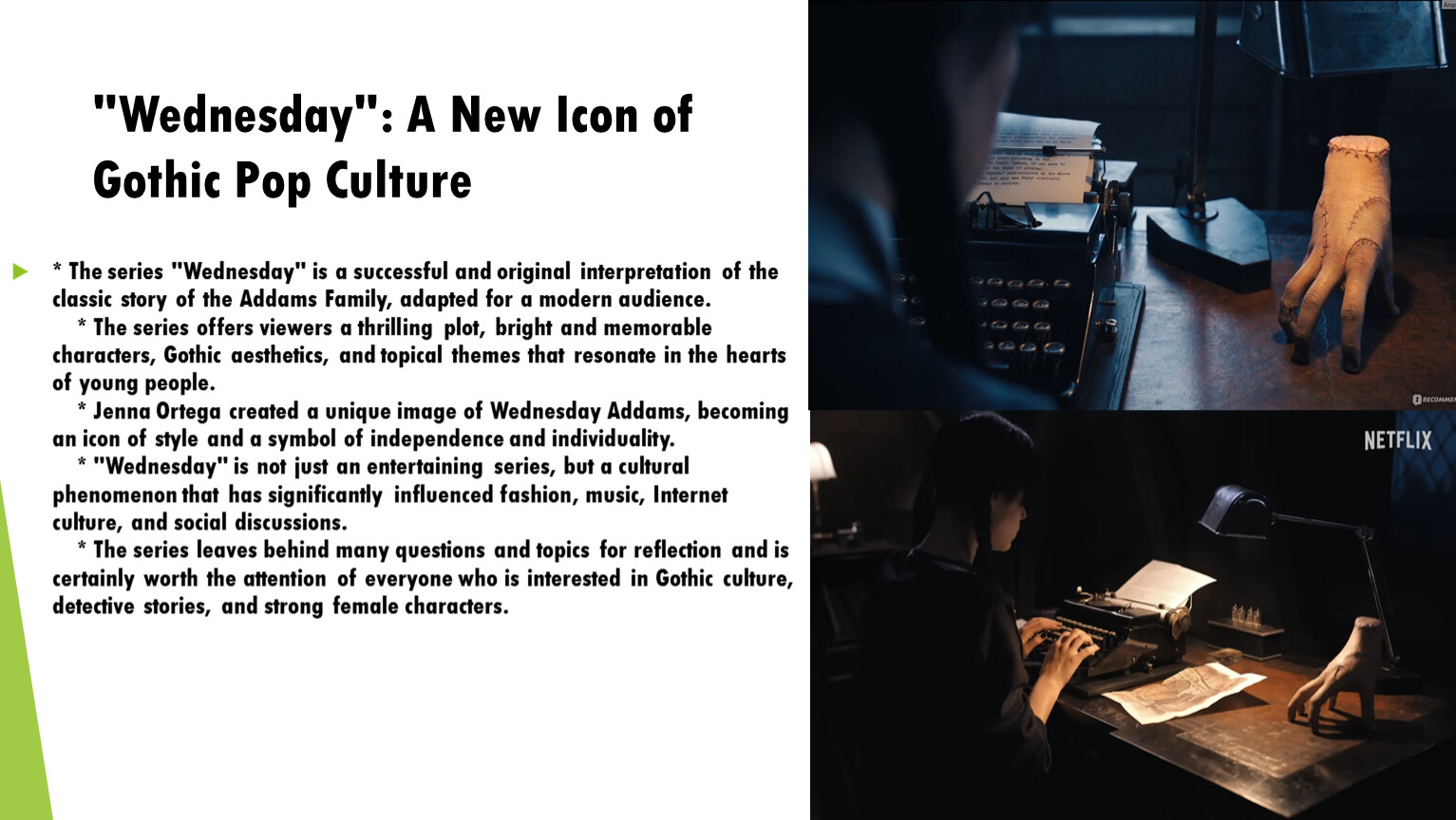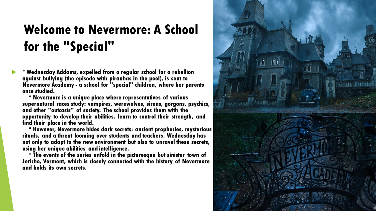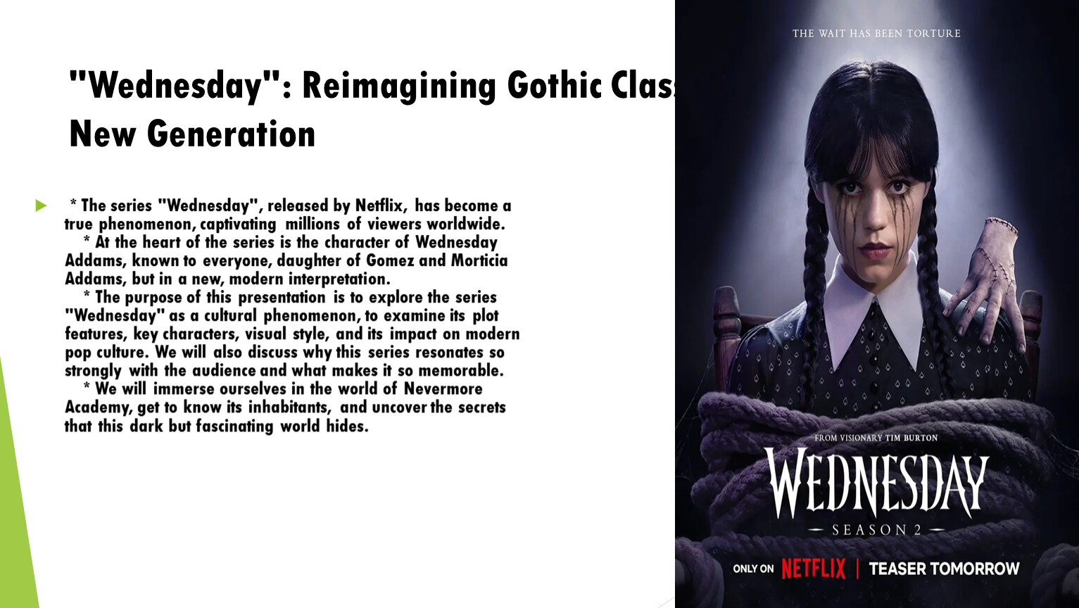 * The series "Wednesday", released by Netflix, has become a true phenomenon, captivating millions of viewers worldwide. * At the heart of the series is the character of Wednesday Addams, known to everyone, daughter of Gomez and Morticia Addams, but in a new, modern interpretation. * The purpose of this presentation is to explore the series "Wednesday" as a cultural phenomenon, to examine its plot features, key characters, visual style, and its impact on modern pop culture. We will also discuss why this series resonates so strongly with the audience and what makes it so memorable. * We will immerse ourselves in the world of Nevermore Academy, get to know its inhabitants, and uncover the secrets that this dark but fascinating world hides.