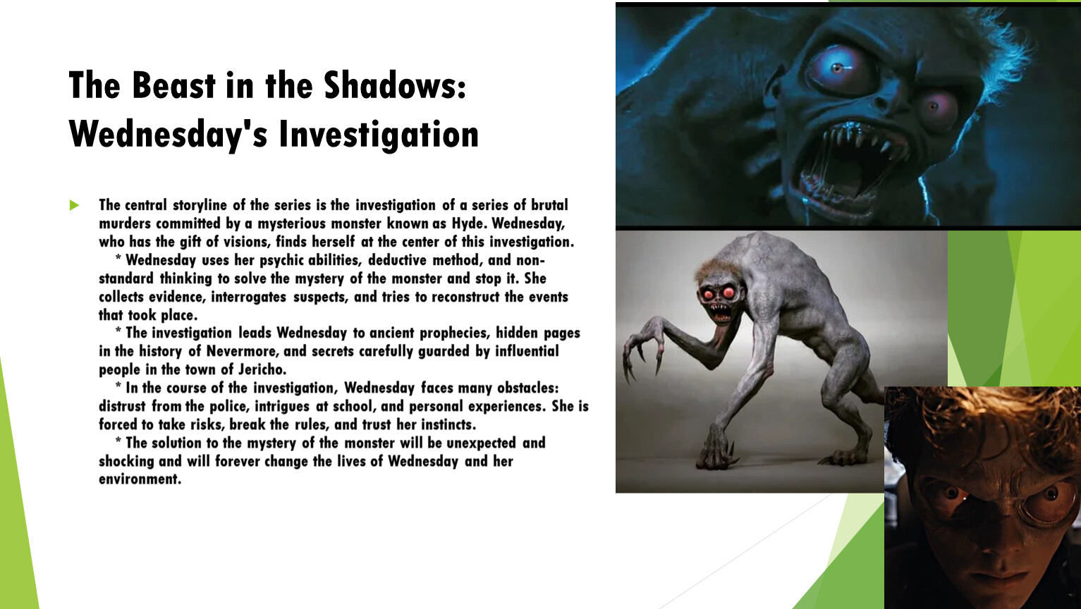 The central storyline of the series is the investigation of a series of brutal murders committed by a mysterious monster known as Hyde. Wednesday, who has the gift of visions, finds herself at the center of this investigation. * Wednesday uses her psychic abilities, deductive method, and non-standard thinking to solve the mystery of the monster and stop it. She collects evidence, interrogates suspects, and tries to reconstruct the events that took place. * The investigation leads Wednesday to ancient prophecies, hidden pages in the history of Nevermore, and secrets carefully guarded by influential people in the town of Jericho. * In the course of the investigation, Wednesday faces many obstacles: distrust from the police, intrigues at school, and personal experiences. She is forced to take risks, break the rules, and trust her instincts. * The solution to the mystery of the monster will be unexpected and shocking and will forever change the lives of Wednesday and her environment.