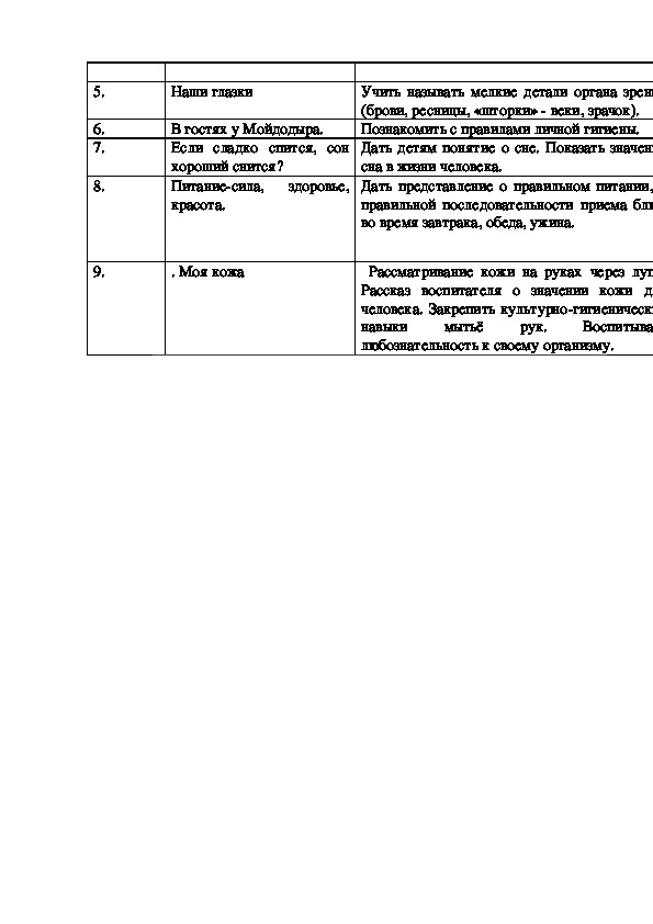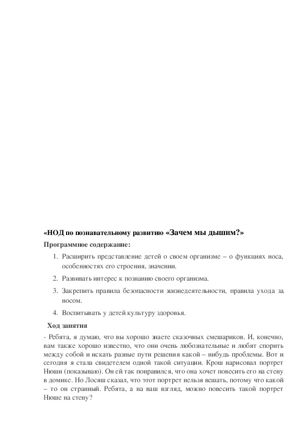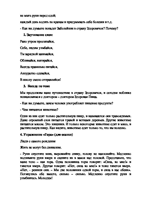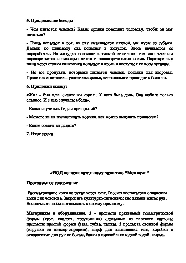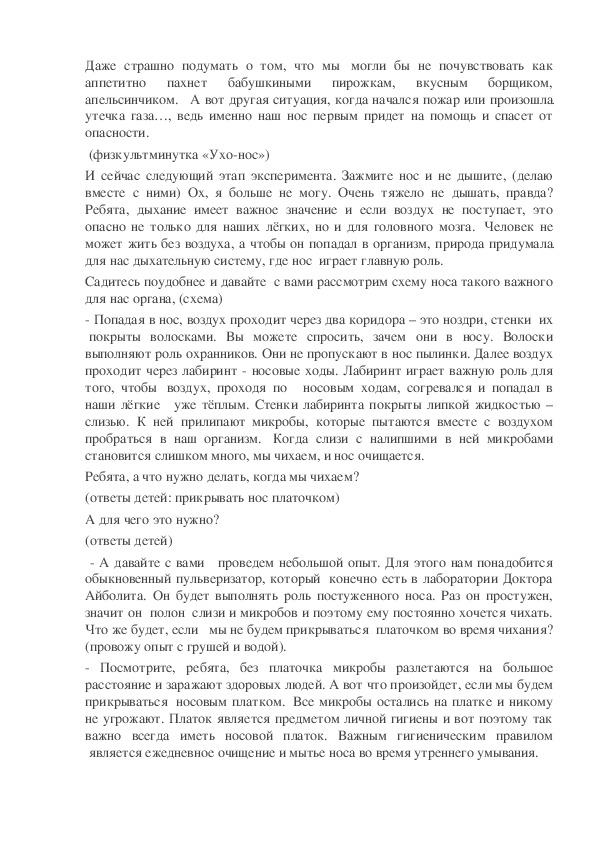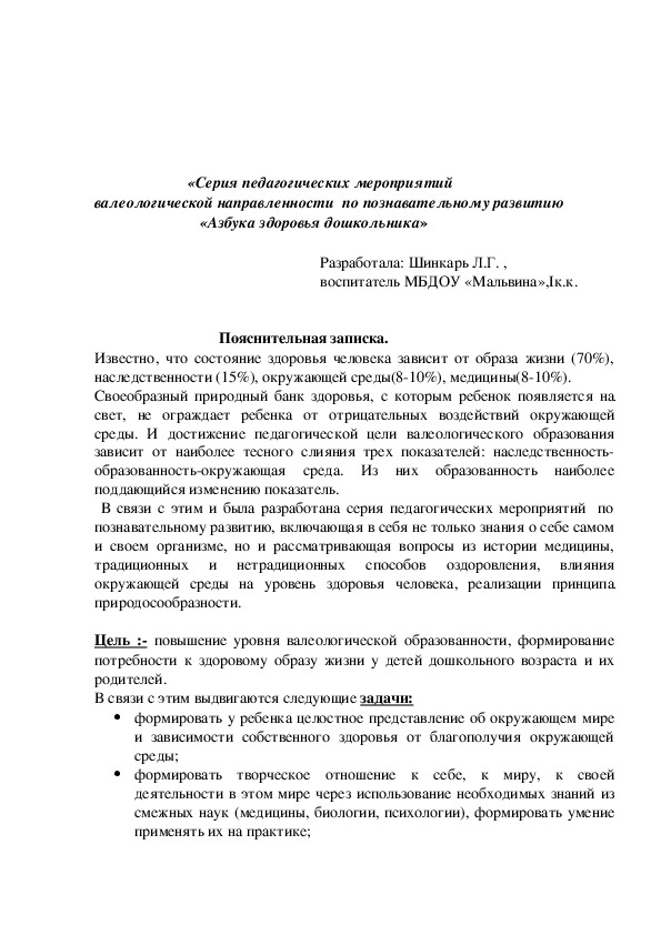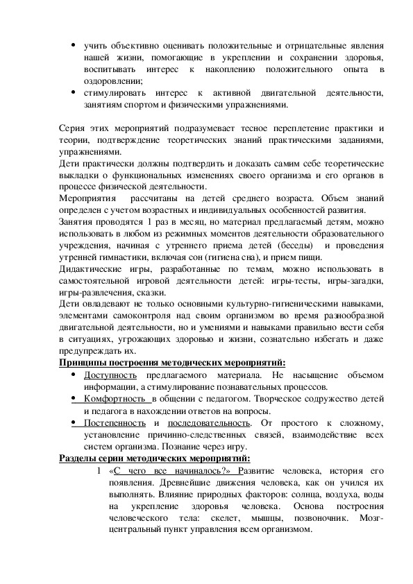 В связи с этим и была разработана серия педагогических мероприятий по познавательному развитию, включающая в себя не только знания о себе самом и своем организме, но и рассматривающая вопросы из истории медицины, традиционных и нетрадиционных способов оздоровления, влияния окружающей среды на уровень здоровья человека, реализации принципа природосообразности.