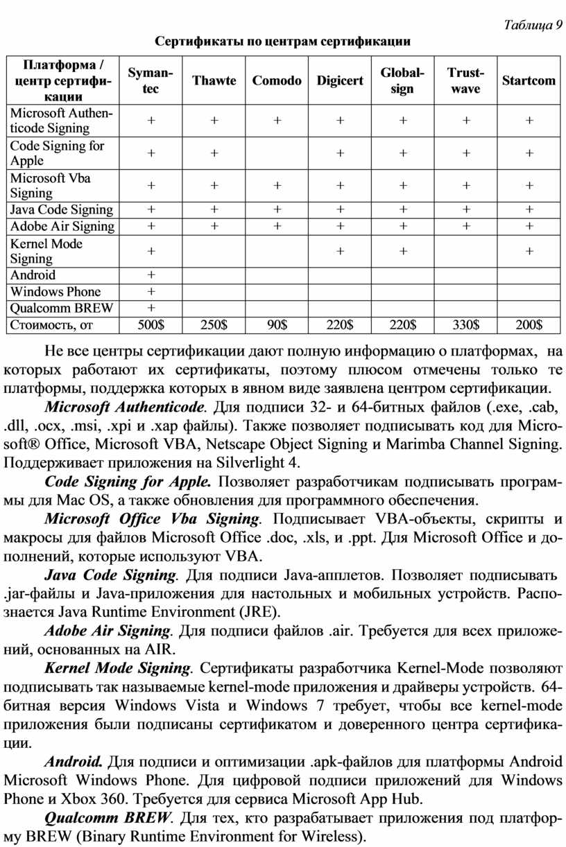 Сертификаты по центрам сертификации, которые их выпускают, пред- ставлены в таблице 9. В колонках указаны названия центров сертификации, а в строках — тип сертификата или технология/платформа, для которой он исполь- зуется.