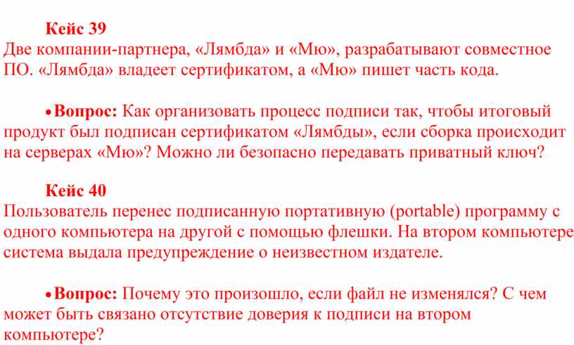 · Вопрос: Как организовать процесс подписи так, чтобы итоговый продукт был подписан сертификатом «Лямбды», если сборка происходит на серверах «Мю»? Можно ли безопасно передавать приватный ключ?