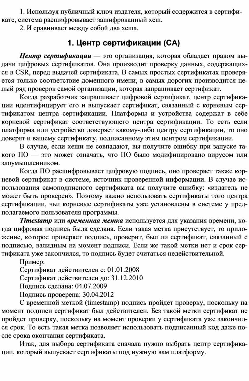 1. Пользователь скачивает или устанавливает подписанное ПО и плат- форма или система пользователя проверяет сертификат издателя, который под- писан корневым приватным ключом центра сертификации.