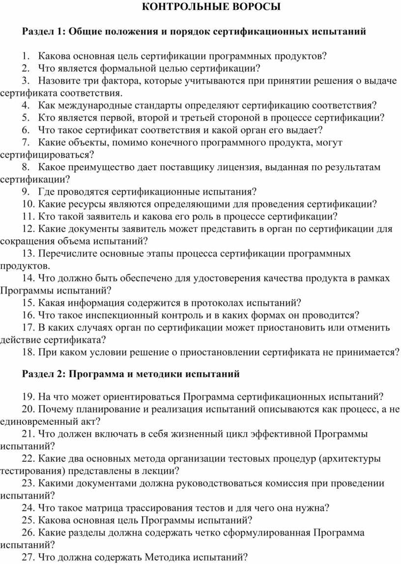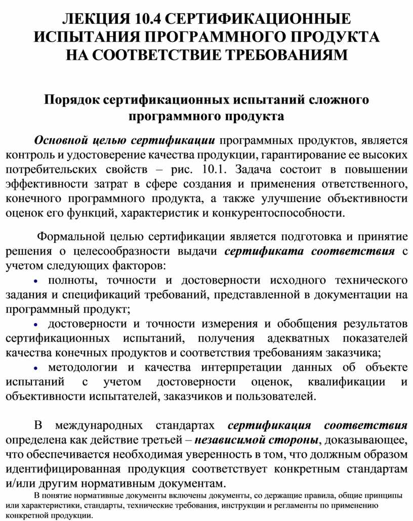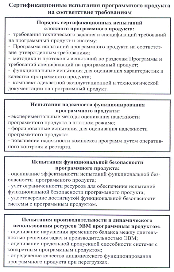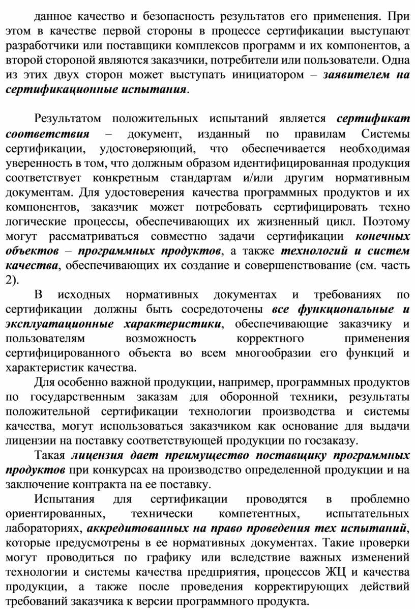 Результатом положительных испытаний является сертификат соответствия - документ, изданный по правилам Системы сертификации, удостоверяющий, что обеспечивается необходимая уверенность в том, что должным образом идентифицированная продукция соответствует конкретным стандартам и/или другим нормативным документам. Для удостоверения качества программных продуктов и их компонентов, заказчик может потребовать сертифицировать техно логические процессы, обеспечивающих их жизненный цикл. Поэтому могут рассматриваться совместно задачи сертификации конечных объектов – программных продуктов, а также технологий и систем качества, обеспечивающих их создание и совершенствование (см. часть 2).