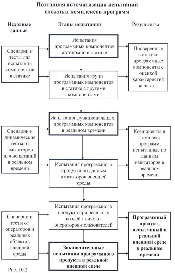 Для обеспечения их высокого качества недостаточны отдельные сценарии и процедуры тестов, а необходимо создавать потоки динамических тестов в реальном времени, адекватные соответствующим данным при функционировании внешней среды систем и/или пользователей (см. рис. 10.1). Эти потоки тестов должны обеспечивать динамическую проверку комплексов программ на соответствие требованиям, выявление дефектов и ошибок в реализации их функций и характеристик в реальном времени. Основная особенность такого тестирования состоит в создании динамической среды функционирования программного продукта, максимально приближенной к реальной, при его практическом применении.