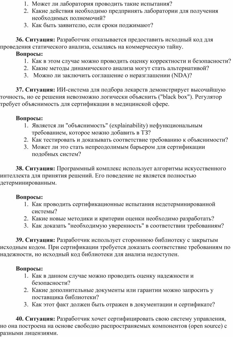 38. Ситуация: Программный комплекс использует алгоритмы искусственного интеллекта для принятия решений. Его поведение не является полностью детерминированным.