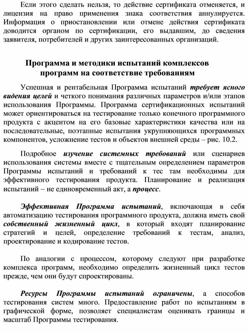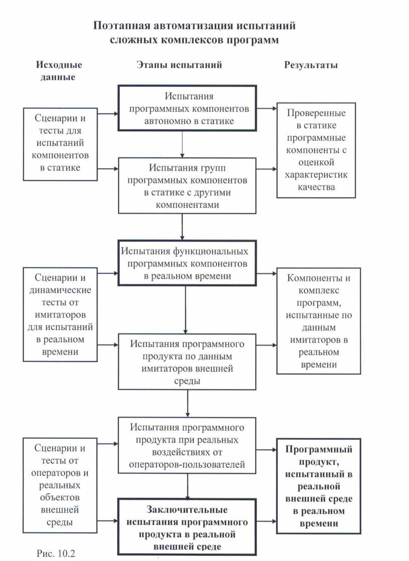 Успешная и рентабельная Программа испытаний требует ясного видения целей и четкого понимания различных параметров и/или этапов использования Программы. Программа сертификационных испытаний может ориентироваться на тестирование только конечного программного продукта с акцентом на его базовые характеристики качества или на последовательные, поэтапные испытания укрупняющихся программных компонентов, усложнение тестов и объектов внешней среды – рис. 10.2.