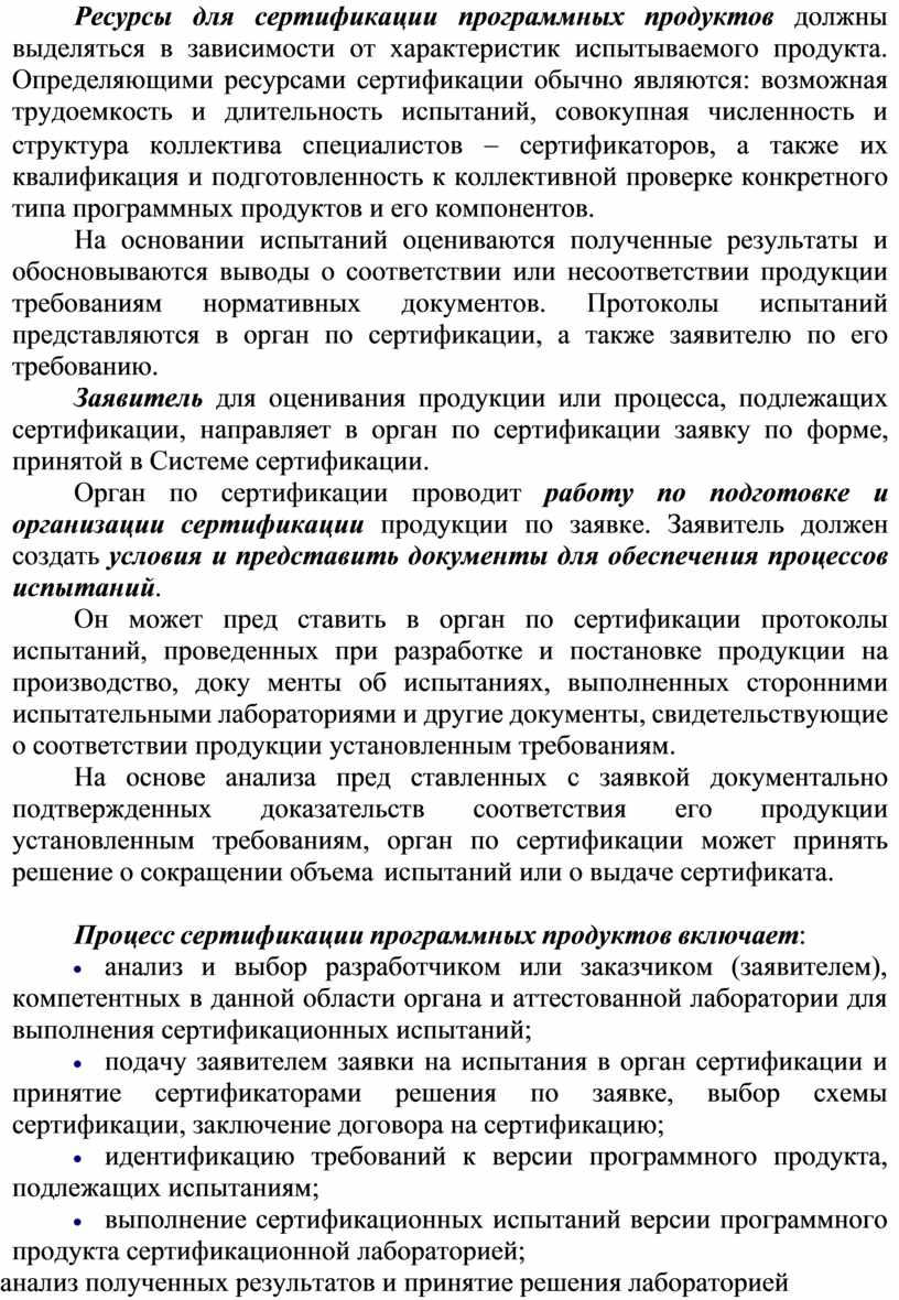 Ресурсы для сертификации программных продуктов должны выделяться в зависимости от характеристик испытываемого продукта. Определяющими ресурсами сертификации обычно являются: возможная трудоемкость и длительность испытаний, совокупная численность и структура коллектива специалистов - сертификаторов, а также их квалификация и подготовленность к коллективной проверке конкретного типа программных продуктов и его компонентов.