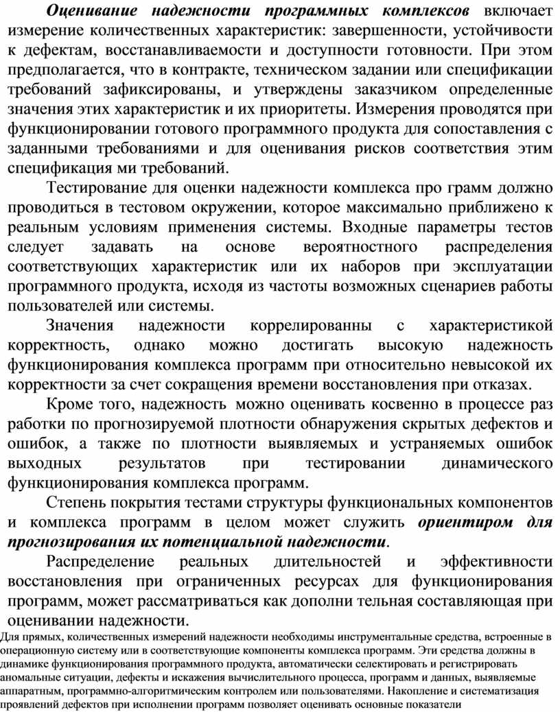 Оценивание надежности программных комплексов включает измерение количественных характеристик: завершенности, устойчивости к дефектам, восстанавливаемости и доступности готовности. При этом предполагается, что в контракте, техническом задании или спецификации требований зафиксированы, и утверждены заказчиком определенные значения этих характеристик и их приоритеты. Измерения проводятся при функционировании готового программного продукта для сопоставления с заданными требованиями и для оценивания рисков соответствия этим спецификация ми требований.