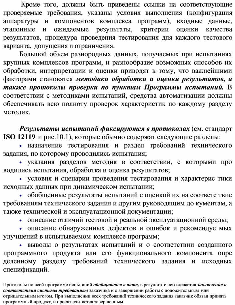 · выводы о результатах испытаний и о соответствии созданного программного продукта или его функционального компонента опре деленному разделу требований технического задания и исходных спецификаций.