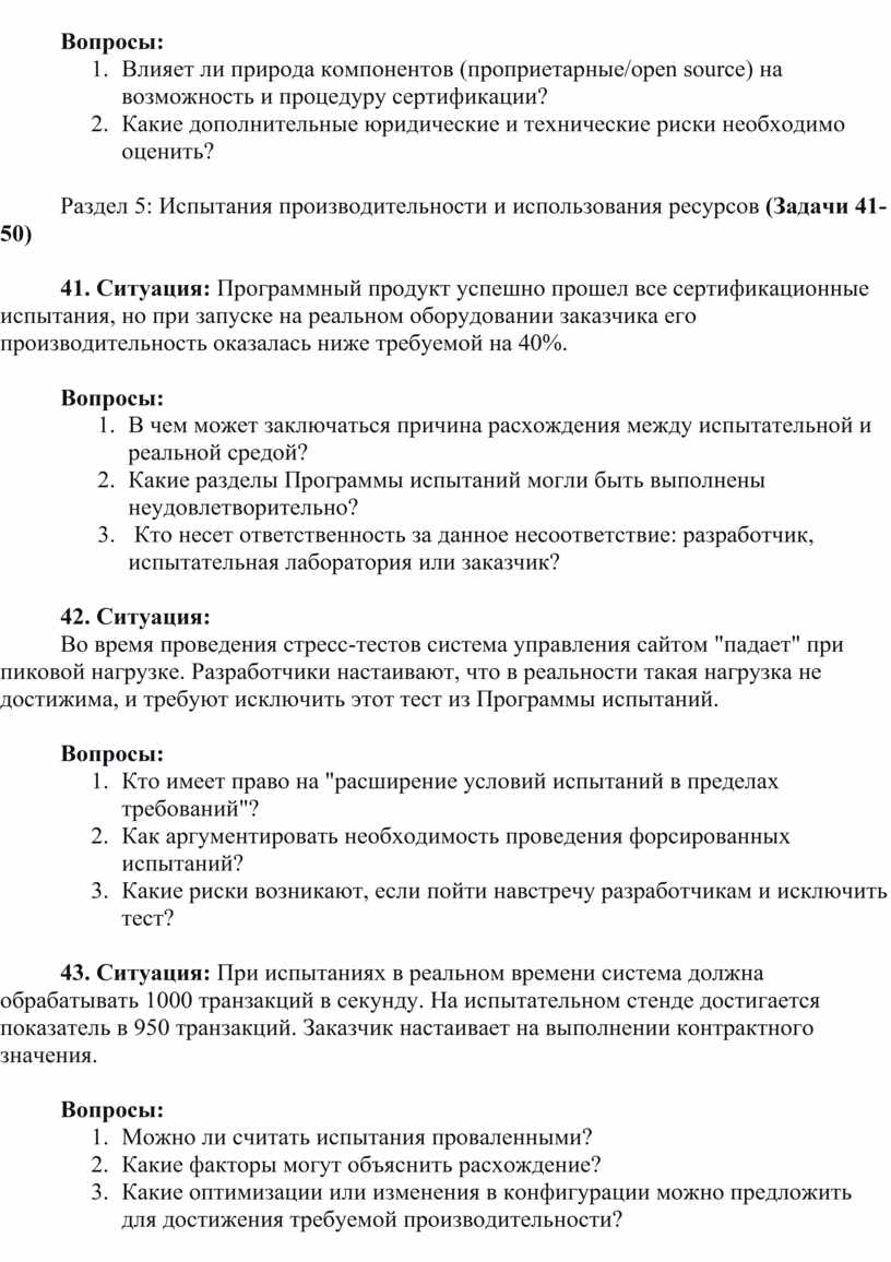 41. Ситуация: Программный продукт успешно прошел все сертификационные испытания, но при запуске на реальном оборудовании заказчика его производительность оказалась ниже требуемой на 40%.