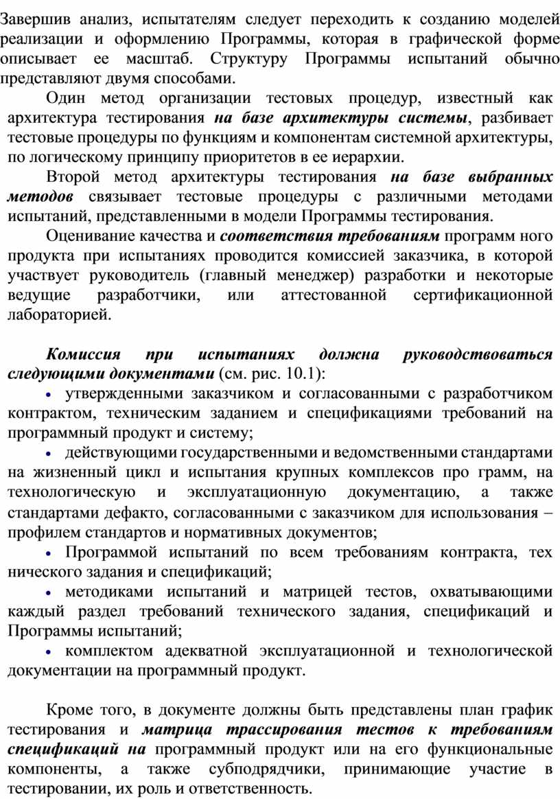 Программа испытаний является серией экспериментов и должна разрабатываться с позиции необходимого объема тестирования в процессе проведения испытаний для проверки выполнения всех требований технического задания и соответствия предъявленной документации. Программа испытаний, методики их проведения и оценки результатов, разработанные совместно заказчиком и разработчиком, должны быть согласованы и утверждены.