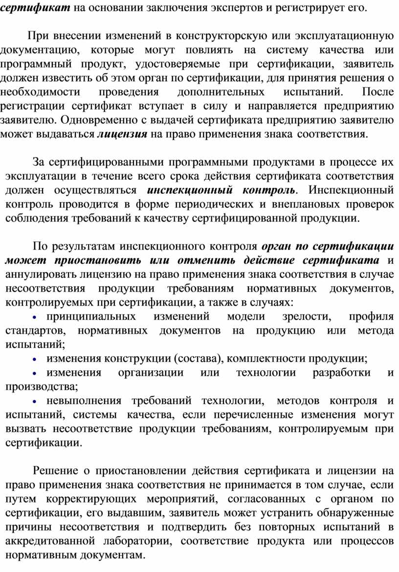 За сертифицированными программными продуктами в процессе их эксплуатации в течение всего срока действия сертификата соответствия должен осуществляться инспекционный контроль. Инспекционный контроль проводится в форме периодических и внеплановых проверок соблюдения требований к качеству сертифицированной продукции.