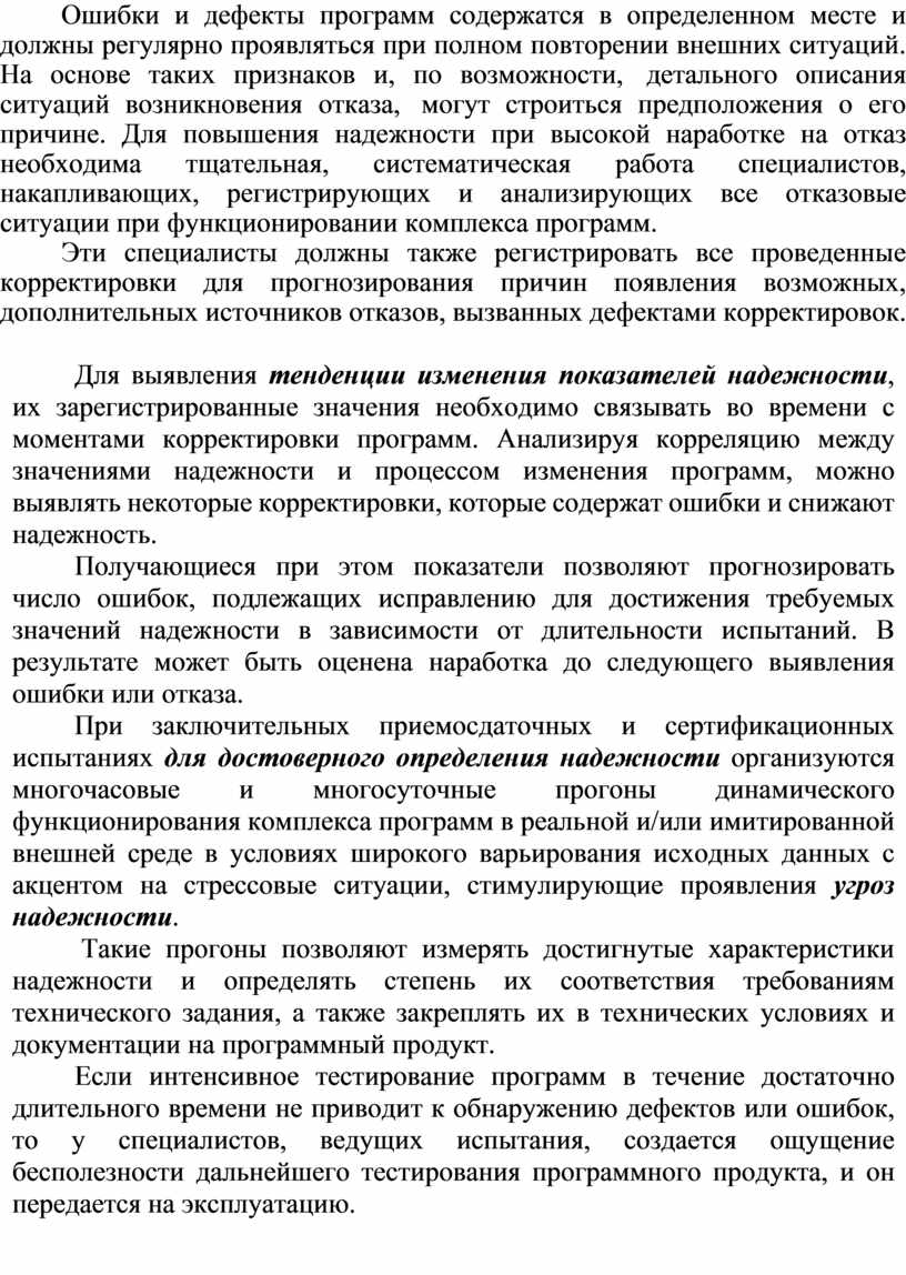 Кроме того, надежность можно оценивать косвенно в процессе раз работки по прогнозируемой плотности обнаружения скрытых дефектов и ошибок, а также по плотности выявляемых и устраняемых ошибок выходных результатов при тестировании динамического функционирования комплекса программ.
