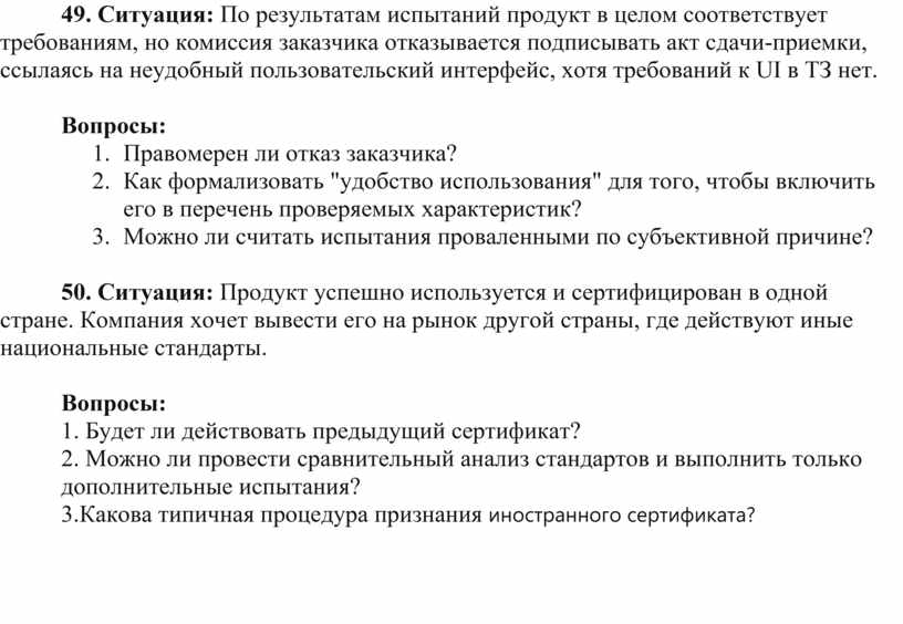 49. Ситуация: По результатам испытаний продукт в целом соответствует требованиям, но комиссия заказчика отказывается подписывать акт сдачи-приемки, ссылаясь на неудобный пользовательский интерфейс, хотя требований к UI в ТЗ нет.