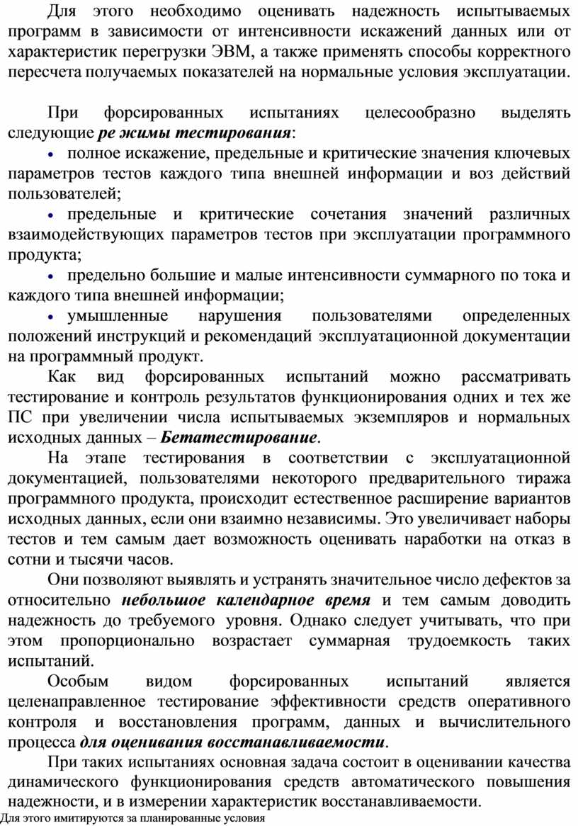 Тестирование для оценки надежности комплекса про грамм должно проводиться в тестовом окружении, которое максимально приближено к реальным условиям применения системы. Входные параметры тестов следует задавать на основе вероятностного распределения соответствующих характеристик или их наборов при эксплуатации программного продукта, исходя из частоты возможных сценариев работы пользователей или системы.
