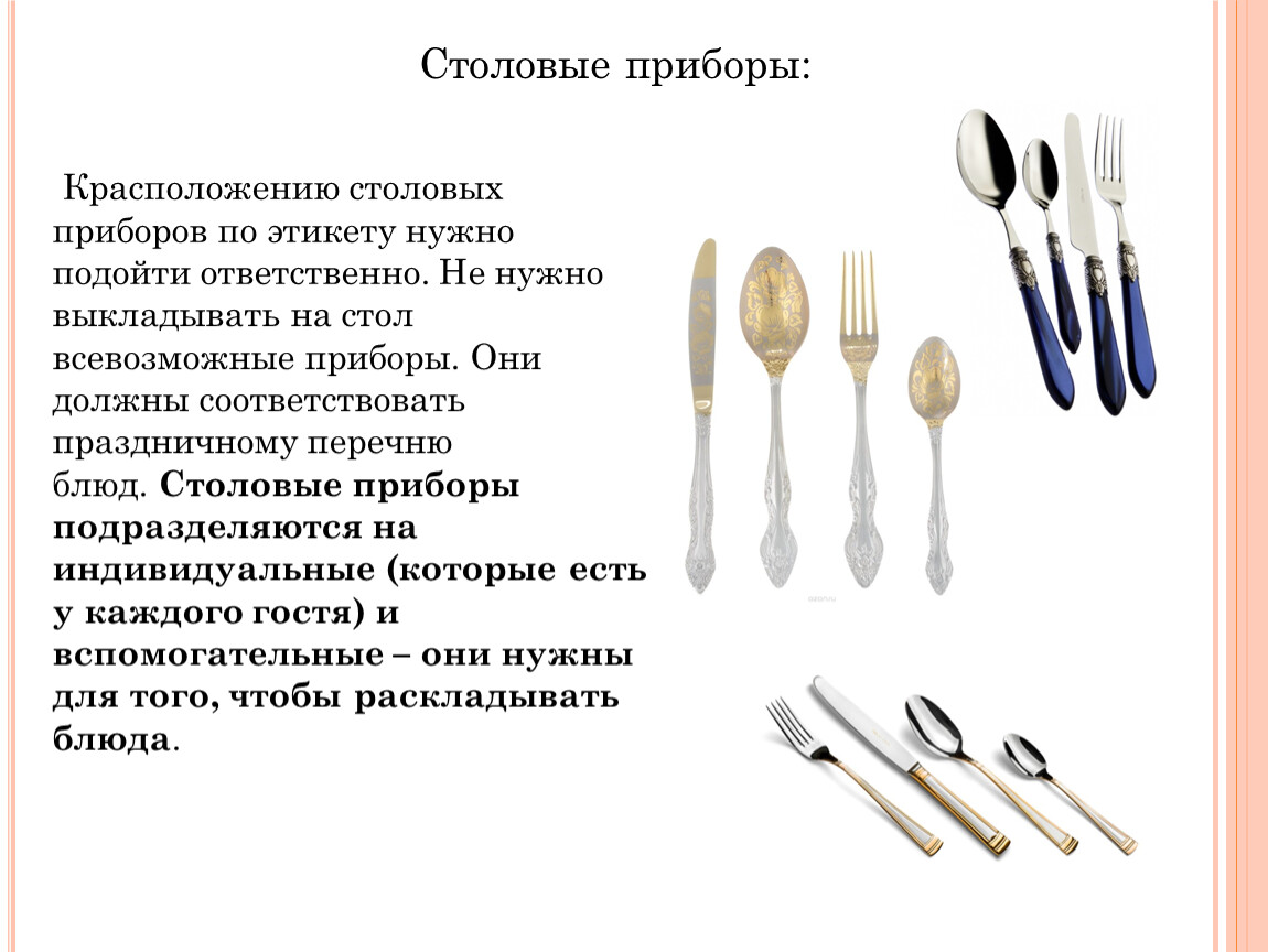 Красположению столовых приборов по этикету нужно подойти ответственно. Не нужно выкладывать на стол всевозможные приборы. Они должны соответствовать праздничному перечню блюд. Столовые приборы подразделяются на индивидуальные (которые есть у каждого гостя) и вспомогательные – они нужны для того, чтобы раскладывать блюда.