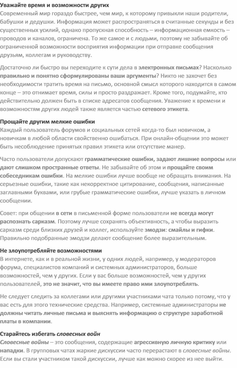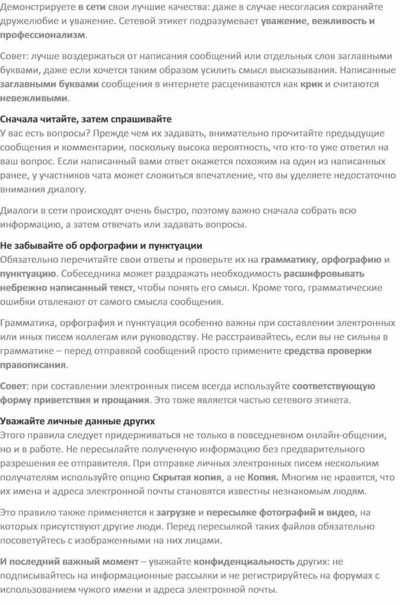 Громоздкий язык и повторы только засоряют чаты и форумы, а грамматические ошибки затрудняют чтение и понимание написанного. Пересылка писем счастья также выходит за рамки уважительного онлайн-общения.