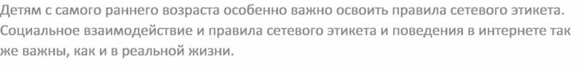 Детям с самого раннего возраста особенно важно освоить правила сетевого этикета. Социальное взаимодействие и правила сетевого этикета и поведения в интернете так же важны, как и в реальной жизни.