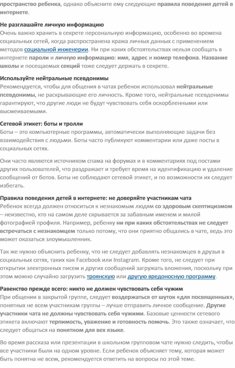 Очень важно хранить в секрете персональную информацию, особенно во времена социальных сетей, когда распространена кража личных данных с применением методов социальной инженерии. Ни при каких обстоятельствах нельзя сообщать в интернете пароли и личную информацию: имя, адрес и номер телефона. Название школы и посещаемых секций тоже следует держать в секрете.