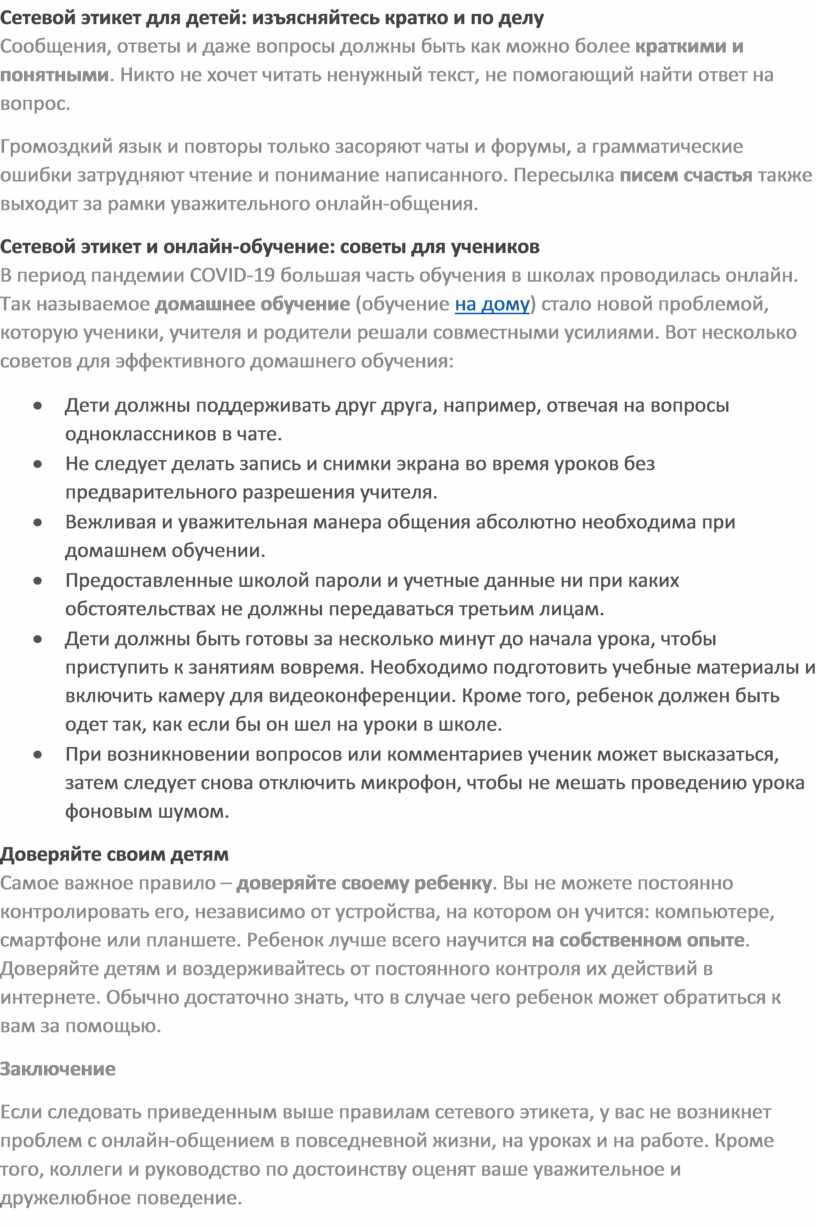 Если следовать приведенным выше правилам сетевого этикета, у вас не возникнет проблем с онлайн-общением в повседневной жизни, на уроках и на работе. Кроме того, коллеги и руководство по достоинству оценят ваше уважительное и дружелюбное поведение.