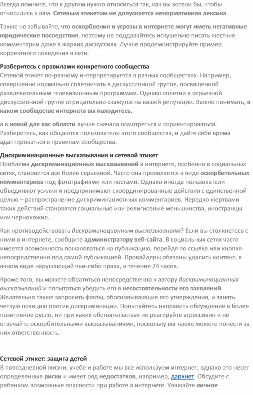 При общении в сети помните о правилах этикета, которых вы придерживаетесь в реальной жизни. Воздержитесь от оскорблений, провокаций, угроз и клеветы, уважайте мнение других участников диалога, высказывайте исключительно конструктивную критику. Помните, что за оскорбления в интернете могут привлечь к ответственности.