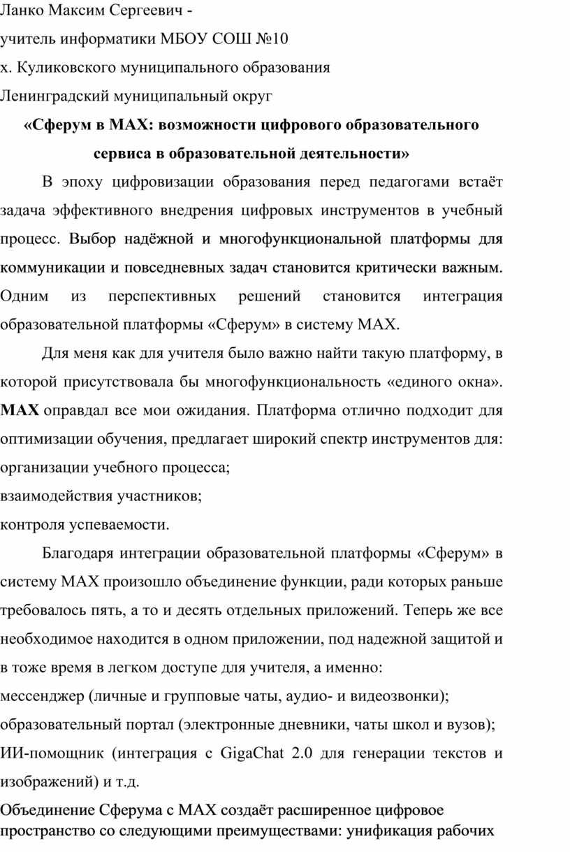 В эпоху цифровизации образования перед педагогами встаёт задача эффективного внедрения цифровых инструментов в учебный процесс. Выбор надёжной и многофункциональной платформы для коммуникации и повседневных задач становится критически важным. Одним из перспективных решений становится интеграция образовательной платформы «Сферум» в систему МАХ.