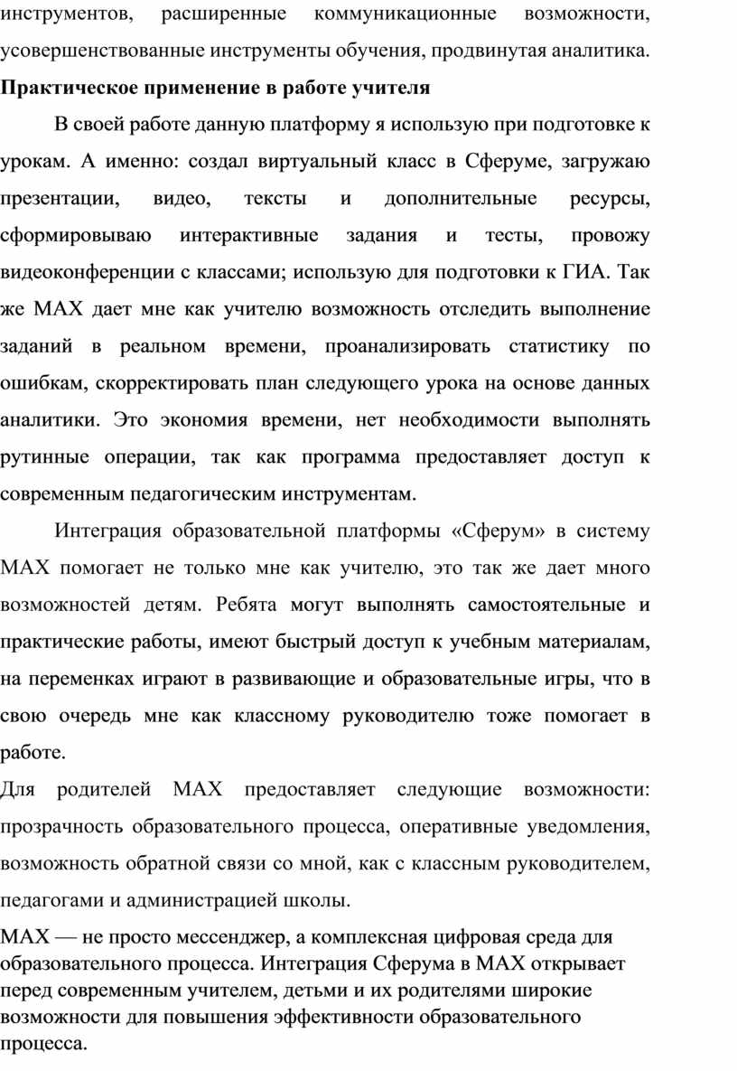 В своей работе данную платформу я использую при подготовке к урокам. А именно: создал виртуальный класс в Сферуме, загружаю презентации, видео, тексты и дополнительные ресурсы, сформировываю интерактивные задания и тесты, провожу видеоконференции с классами; использую для подготовки к ГИА. Так же МАХ дает мне как учителю возможность отследить выполнение заданий в реальном времени, проанализировать статистику по ошибкам, скорректировать план следующего урока на основе данных аналитики. Это экономия времени, нет необходимости выполнять рутинные операции, так как программа предоставляет доступ к современным педагогическим инструментам.