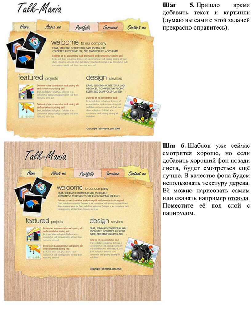 Шаг 5. Пришло время добавить текст и картинки (думаю вы сами с этой задачей прекрасно справитесь). |