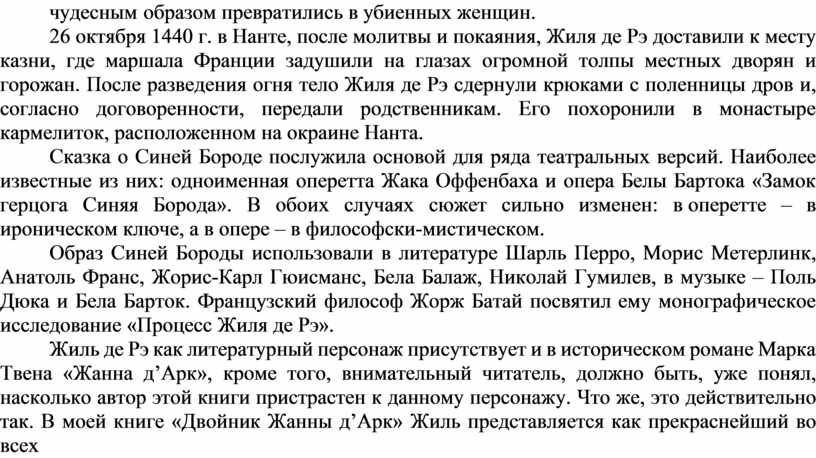 Жиль де Рэ как литературный персонаж присутствует и в историческом романе Марка Твена «Жанна д’Арк», кроме того, внимательный читатель, должно быть, уже понял, насколько автор этой книги пристрастен к данному персонажу. Что же, это действительно так. В моей книге «Двойник Жанны д’Арк» Жиль представляется как прекраснейший во всех