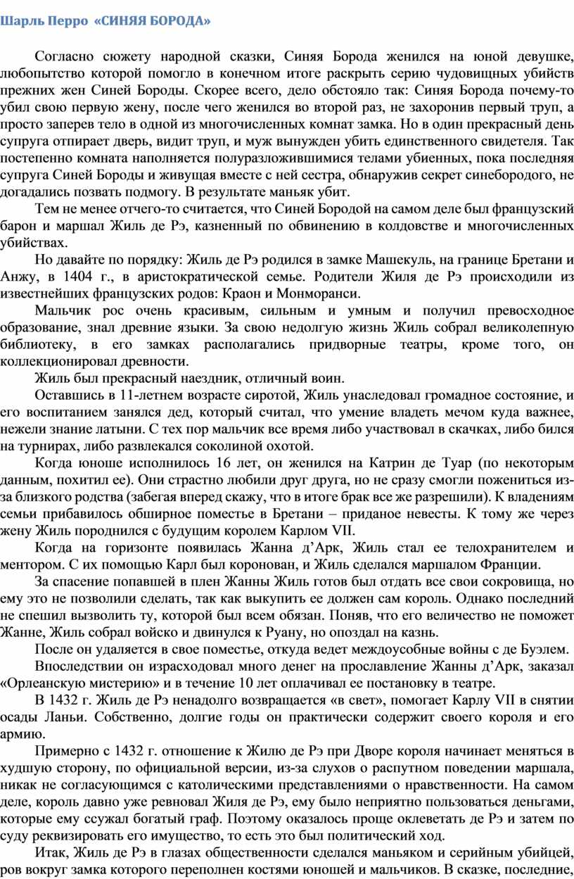 Тем не менее отчего-то считается, что Синей Бородой на самом деле был французский барон и маршал Жиль де Рэ, казненный по обвинению в колдовстве и многочисленных убийствах.