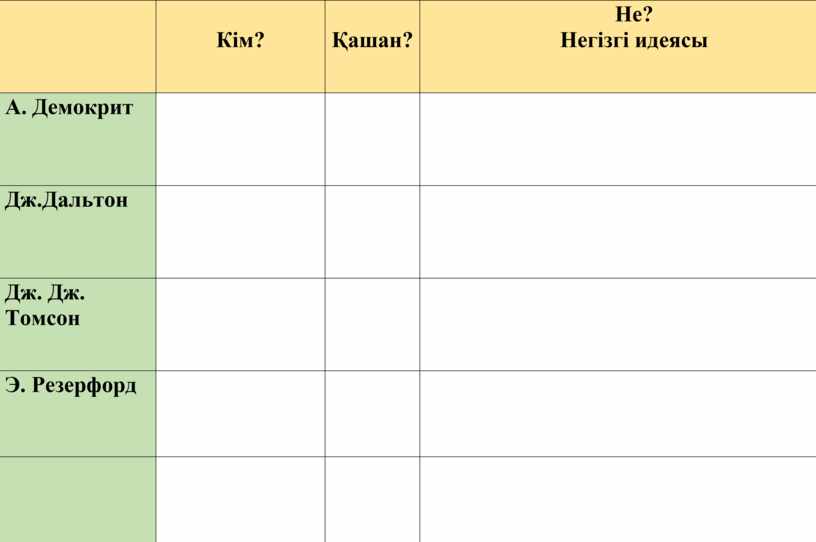 Әр химиялық элементке әмбебап өзінің атомы бар. Атомдар бөлінбейді Барлық элементтер атомдардан тұрады; Ұқсас элементтердің атомдары ұқсас; Атомдар химиялық реакция кезінде жоғалмайды; |