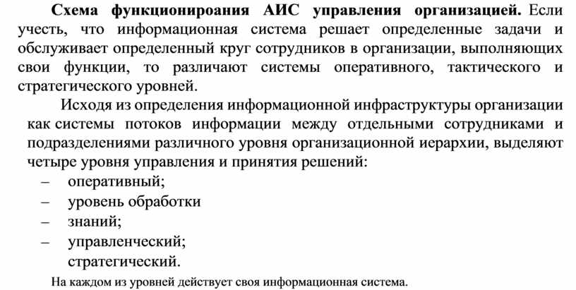 Схема функционироания АИС управления организацией. Если учесть, что информационная система решает определенные задачи и обслуживает определенный круг сотрудников в организации, выполняющих свои функции, то различают системы оперативного, тактического и стратегического уровней.