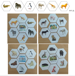 При изучении/закреплении животных разных климатических зон, готовятся шестиугольники с изображением животных. Задача ребенка – выбрать нужных животных, объяснить свой выбор и рассказать о среде обитания данных животных