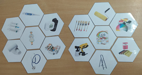 При изучении/закреплении профессий на шестиугольниках могут быть изображены предметы или инструменты, которые необходимы для данного специалиста. Ребенок выбирает нужные гексы, складывает пазл и объясняет свой выбор