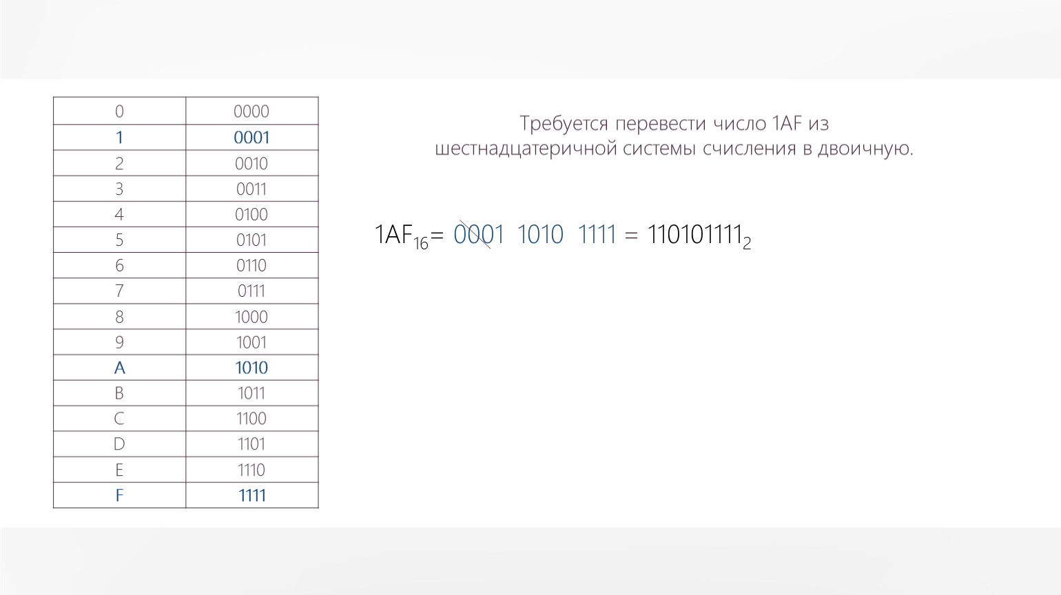 Требуется перевести число 1АF из шестнадцатеричной системы счисления в двоичную.