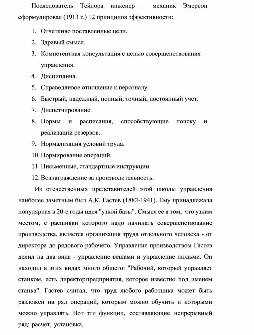 Из отечественных представителей этой школы управления наиболее заметным был А.К. Гастев (1882-1941). Ему принадлежала популярная в 20-е годы идея "узкой базы". Смысл ее в том, что узким местом, с расшивки которого надо начинать совершенствование производства, является организация труда отдельного человека - от директора до рядового рабочего. Управление производством Гастев делил на два вида - управление вещами и управление людьми. Он находил в этих видах много общего: "Рабочий, который управляет станком, есть директор предприятия, которое известно под именем станка". Гастев считал, что труд любого работника может быть разложен на ряд операций, которым можно обучить и которыми можно управлять. Вот эти функции, составляющие непрерывный ряд: расчет, установка,