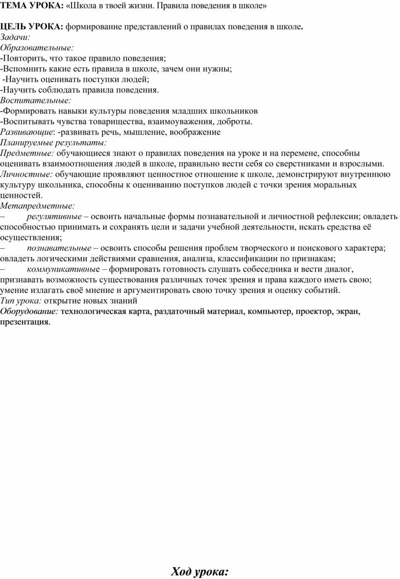 Предметные: обучающиеся знают о правилах поведения на уроке и на перемене, способны оценивать взаимоотношения людей в школе, правильно вести себя со сверстниками и взрослыми.