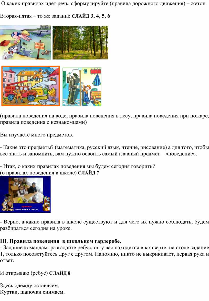 (правила поведения на воде, правила поведения в лесу, правила поведения при пожаре, правила поведения с незнакомцами)